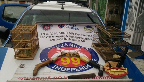 “Realizamos o acompanhamento e em situação de flagrante adentramos ao imóvel, onde encontramos duas armas de fogo de fabricação caseira, uma máscara utilizada em furtos e roubos na região, além de pássaros silvestres do tipo Papa-Capim.